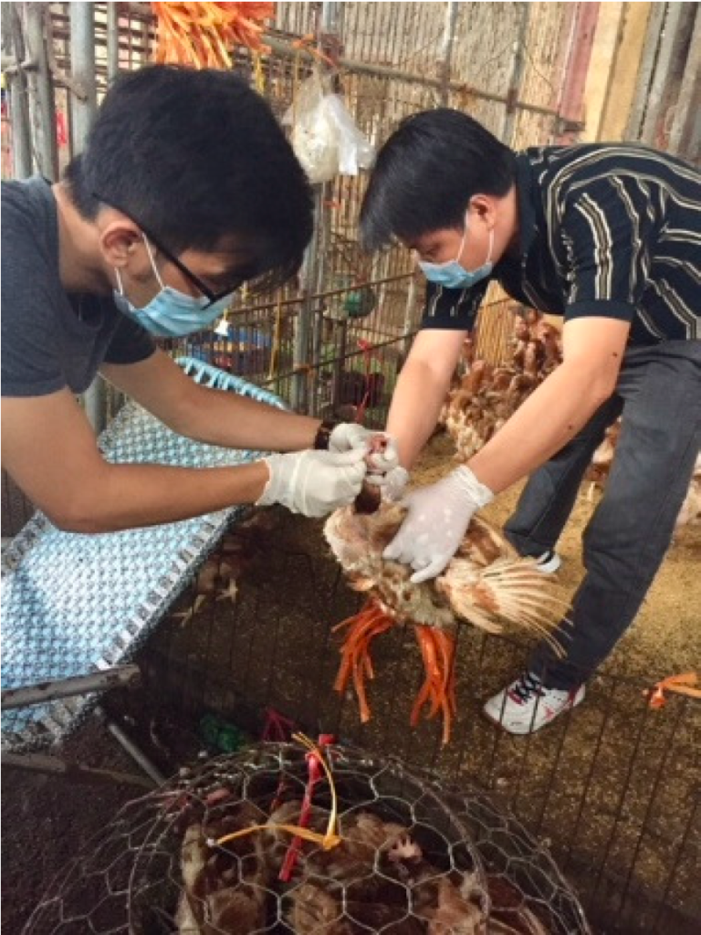 Vietnam-AI-768×1024 Published October 3, 2018 at 768 × 1024 in Bioaerosol sampling to detect avian influenza virus in Hanoi’s largest live poultry market Researchers collect oropharyngeal specimens from chicken (PC: Katie McCallion)